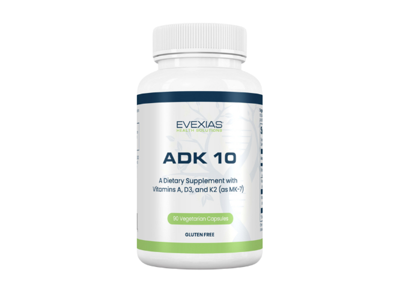 ADK 10 is a professional-grade Nutraceutical that strategically combines the essential fat-soluble vitamins A, D3, and K2 into a single, powerful daily capsule. This formula is expertly designed to work synergistically to support healthy calcium metabolism, promote bone density, fortify immune function, and encourage hormonal balance. ADK 10 is formulated with 10,000 IU of Vitamin D3 for individuals requiring more intensive therapy. This formulation helps address common vitamin deficiencies and supports long-term health outcomes related to the skeletal, immune, cardiovascular, and endocrine systems.