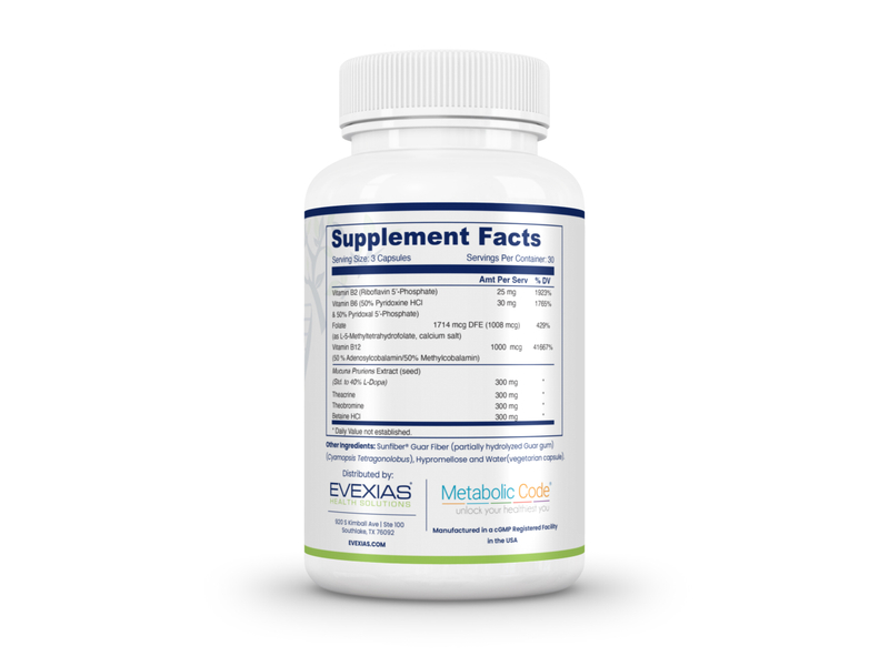 Mucuna pruriens provides a natural source of L-DOPA, a direct precursor to dopamine, which improves reward response, focus, and motivation. Methylated B vitamins (L-5 MTHF, Methylcobalamin) support methylation and homocysteine clearance, enhancing neurotransmitter synthesis. Trimethylglycine (Betaine) serves as a methyl donor, supporting energy metabolism and ensuring methyl group availability. Theobromine and Theacrine promote alertness, attention, and sustained cognitive energy without overstimulating the central nervous system. This powerful synergy helps the brain generate and regulate dopamine, manage oxidative stress, and promote clean energy.