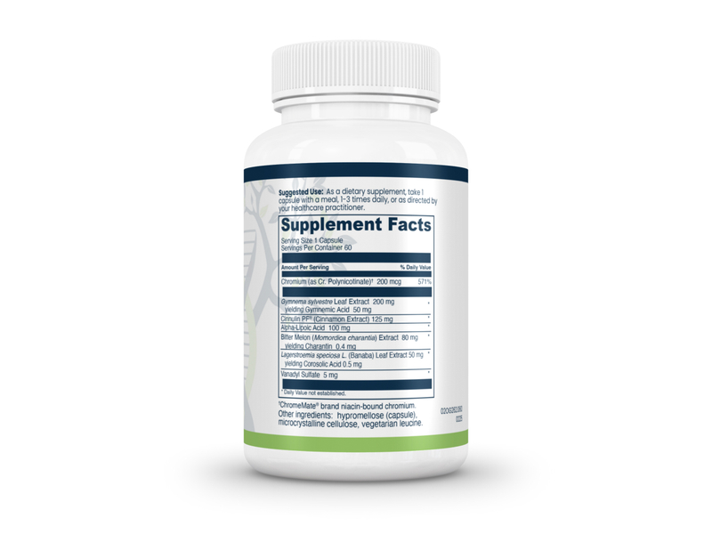 Gluco Metabolic Complex works through multiple complementary pathways. It enhances insulin receptor sensitivity and glucose transport across cell membranes (via Chromium, Banaba, Vanadyl Sulfate), reduces intestinal sugar absorption and sweet cravings (via Gymnema), and mimics insulin to support efficient glucose utilization (via Bitter Melon and Cinnulin PF®). It also supports mitochondrial energy production and combats oxidative damage from elevated blood sugar (via Alpha-Lipoic Acid) and activates AMPK pathways to support metabolic flexibility and weight control.