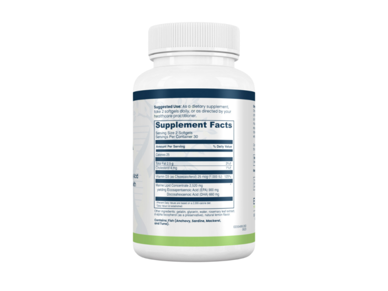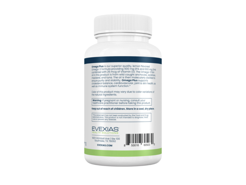 Omega Pro by EVEXIAS Health Solutions is a high-potency omega-3 supplement enriched with EPA (Eicosapentaenoic Acid) and DHA (Docosahexaenoic Acid), two essential fatty acids proven to support brain, heart, and immune health. Each serving also includes 1,000 IU of Vitamin D3, a fat-soluble vitamin that enhances immune response and reduces inflammation. This expertly formulated blend delivers robust support for neurological function, cardiovascular integrity, joint comfort, metabolic balance, and more. With exceptional purity and potency, Omega Pro is ideal for patients seeking comprehensive anti-inflammatory and lipid-regulating benefits in a single daily formula.