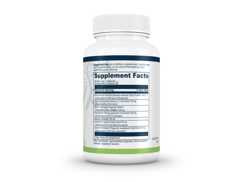Phyto Defense operates through multiple biological pathways to optimize cellular defense. Sulforaphane from broccoli sprouts activates Nrf2, a master regulator of the body's detoxification and antioxidant response. Green tea EGCG and resveratrol modulate inflammatory cytokines and protect the mitochondria. Meriva® turmeric offers highly bioavailable curcumin for inflammation regulation, while quercetin and pomegranate deliver robust vascular and immune benefits. Lycopene, a lipid-soluble antioxidant, helps neutralize lipid peroxides and supports cardiovascular and prostate health. This formula is a true multi-targeted antioxidant system that boosts detox pathways, quenches free radicals, and protects tissue from oxidative insults.